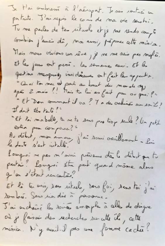 Être ici est tout aussi important qu’être ailleurs, c’est tout aussi romanesque. Le personnage d’ici devra répondre à une lettre dont il ignore tout du contenu et de son auteur avant de la décacheter.