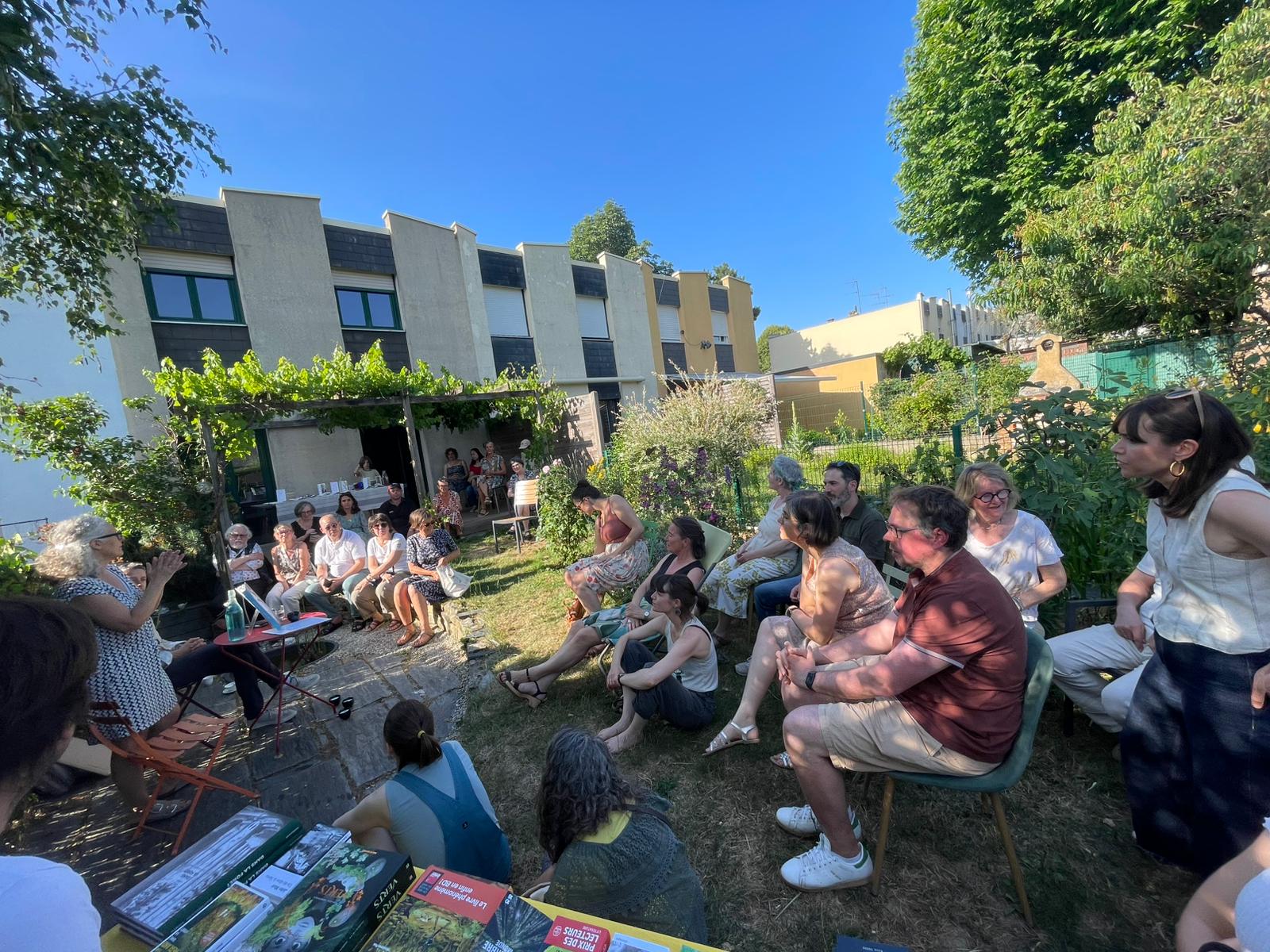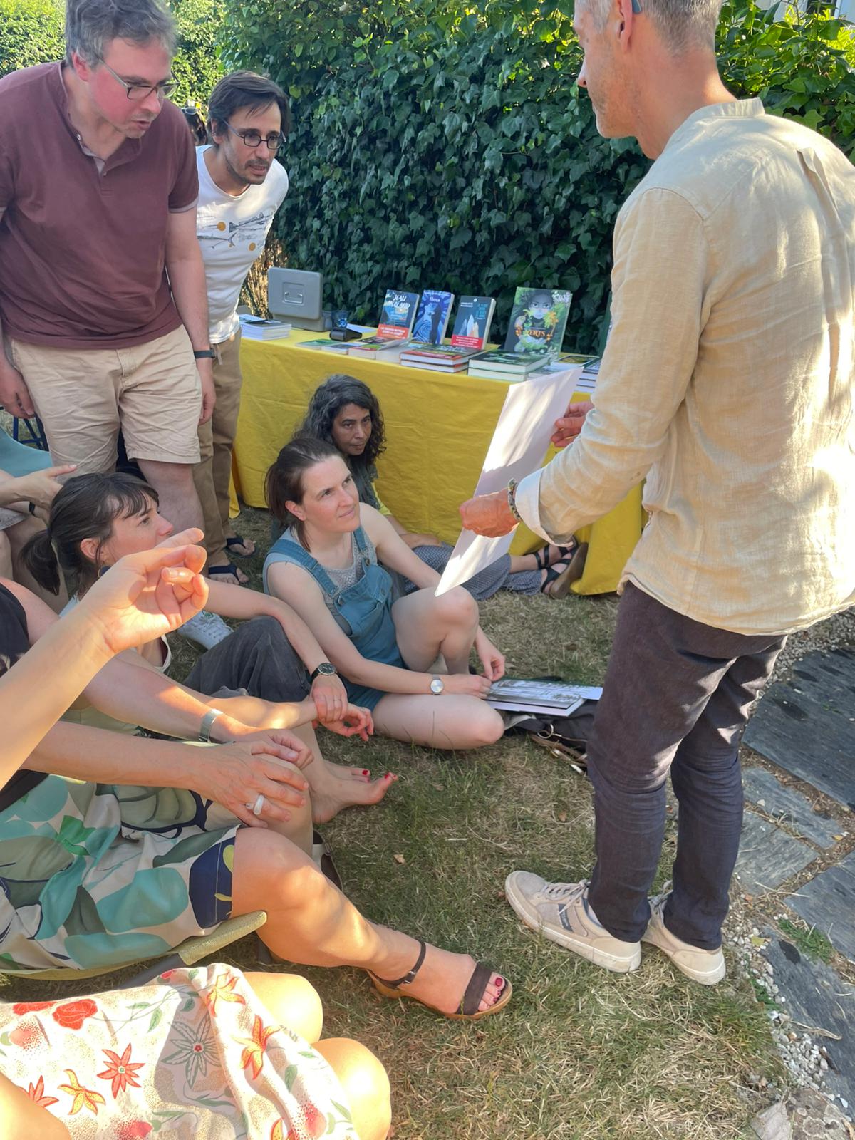 C’était le 19 juin 2025, il faisait beau, nous étions dans le jardin, un stand de vente de bougies par Axelle de Lueurs d’antan et un stand librairie tenu par Julien du Lieu Jaune ont ravi les spectateurs.