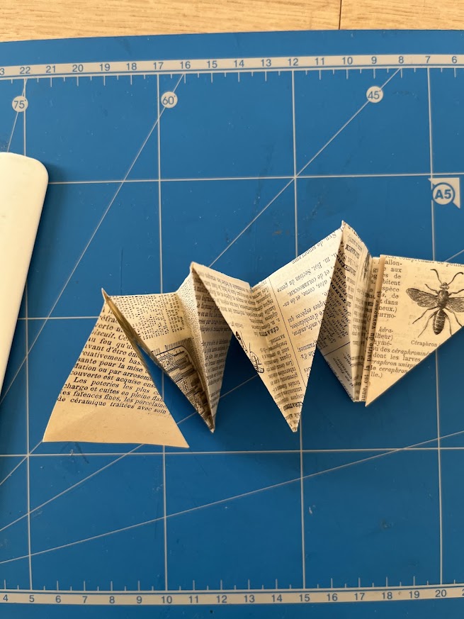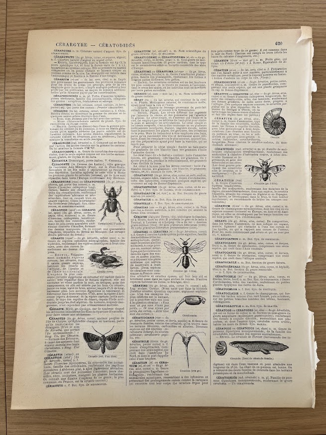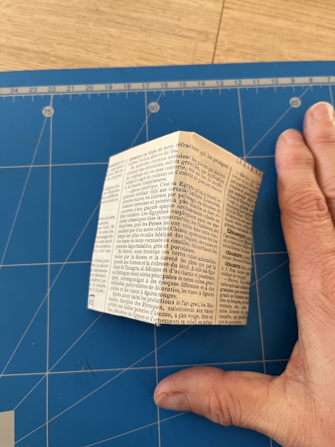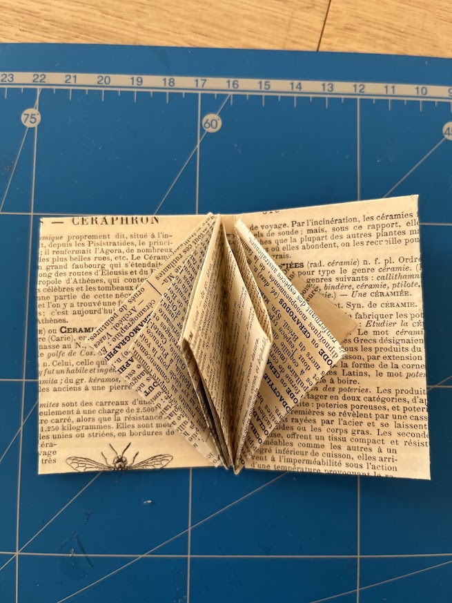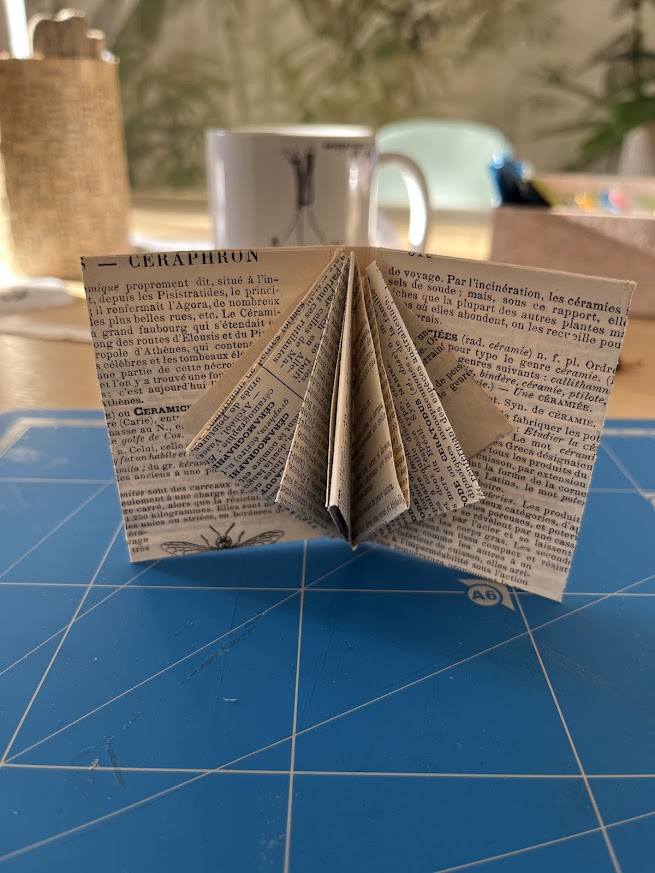 Aucun limite à votre imagination pour la matériau que vous utiliserez ! Ici, j’ai récupéré une page de vieille encyclopédie. D’un rectangle, j’en ai fait un carré magique. Puis j’ai plié et découpé. Enfin, j’ai collé…